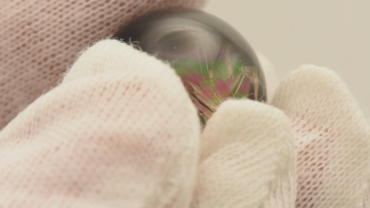 Beautiful piece of smoky quartz crystal with lots of internal fractures causing the appearance of rainbows, magnified by its being sculpted into a round sphere.