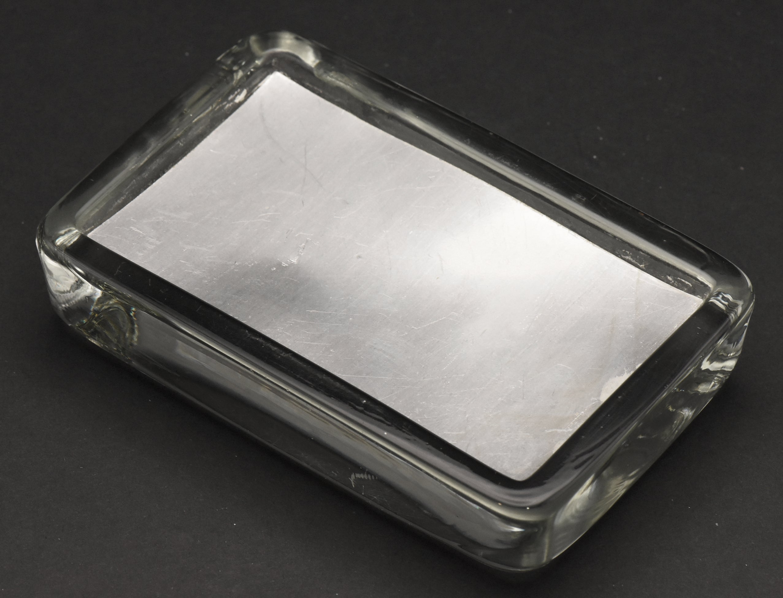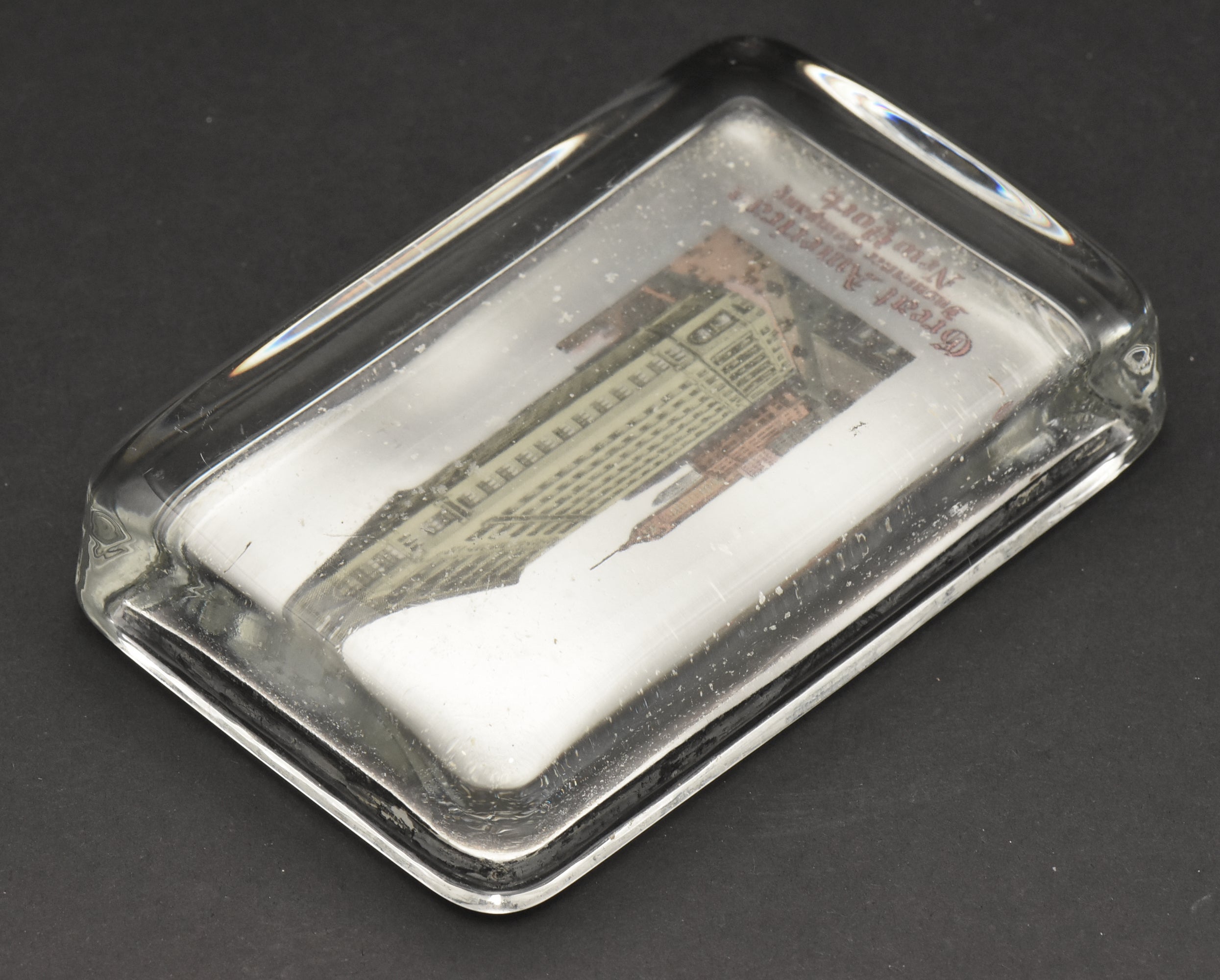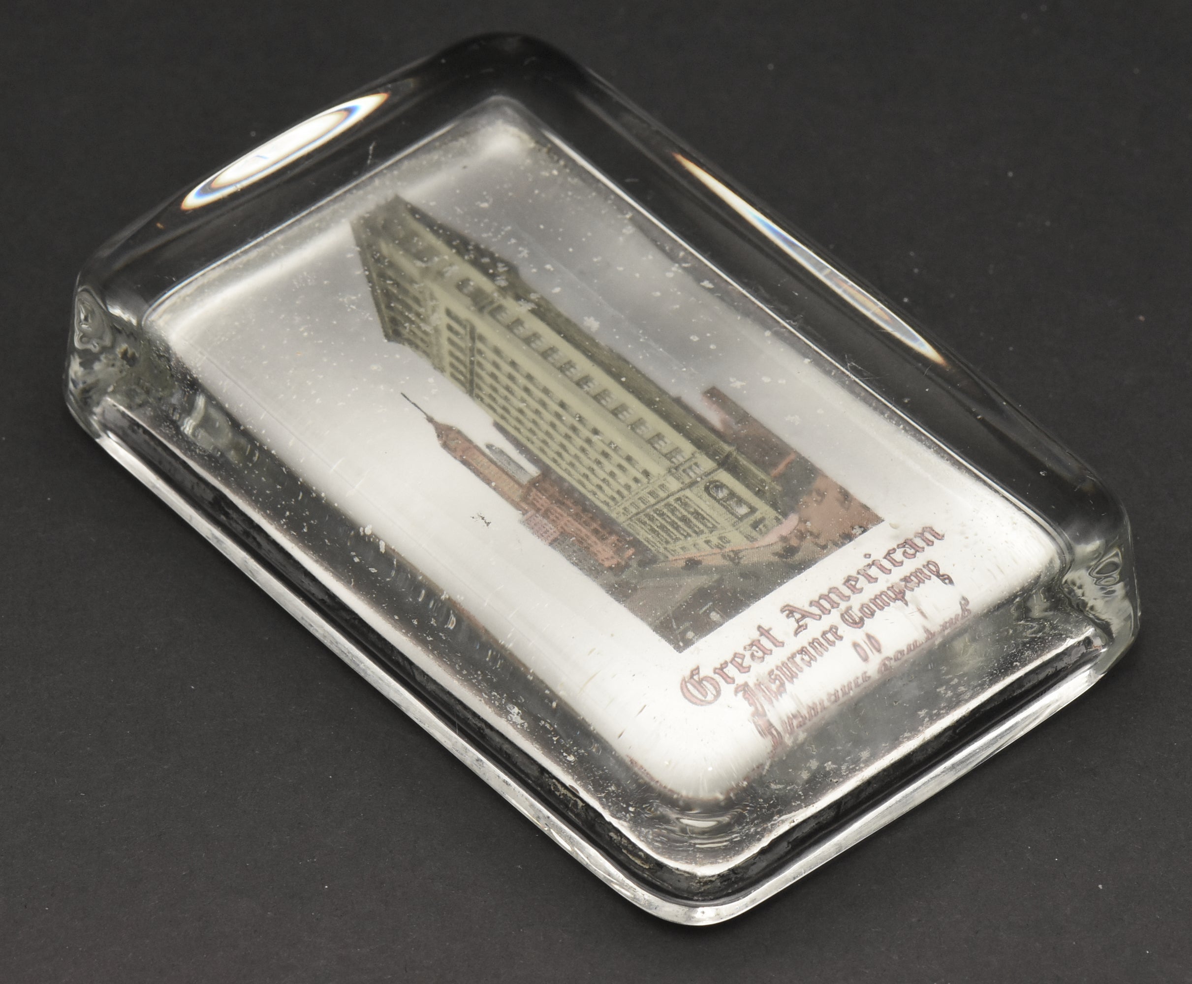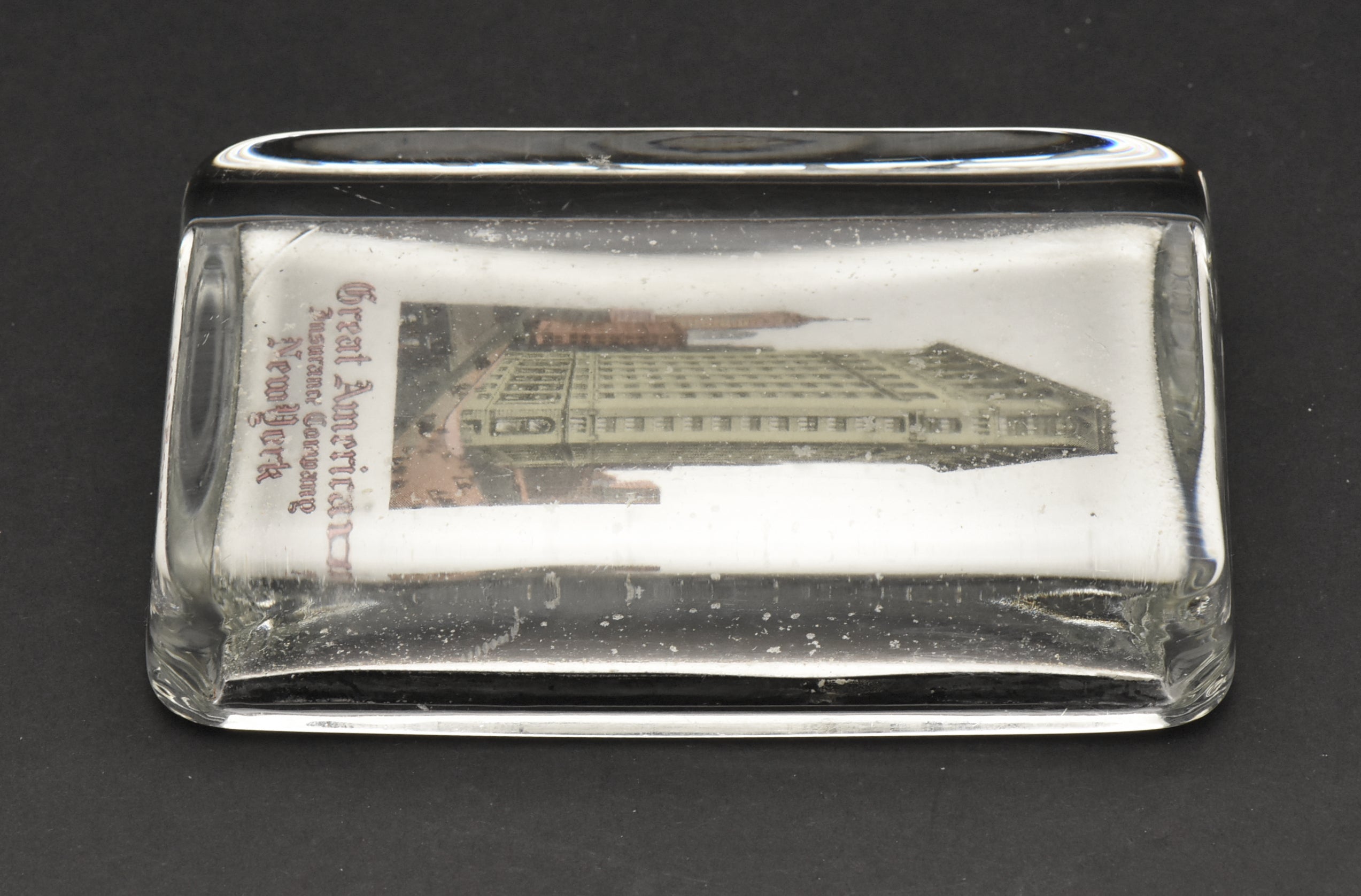 Really cool vintage piece of advertising, a rectangular glass paperweight, set with a piece of metal printed with a picture of the Flatiron Building in New York City, with the Empire State Building in the background. Underneath is inscribed " Great American Insurance Company New York". Note: The spots on the picture appear to be on the underside of the glass, not on the metal itself.
